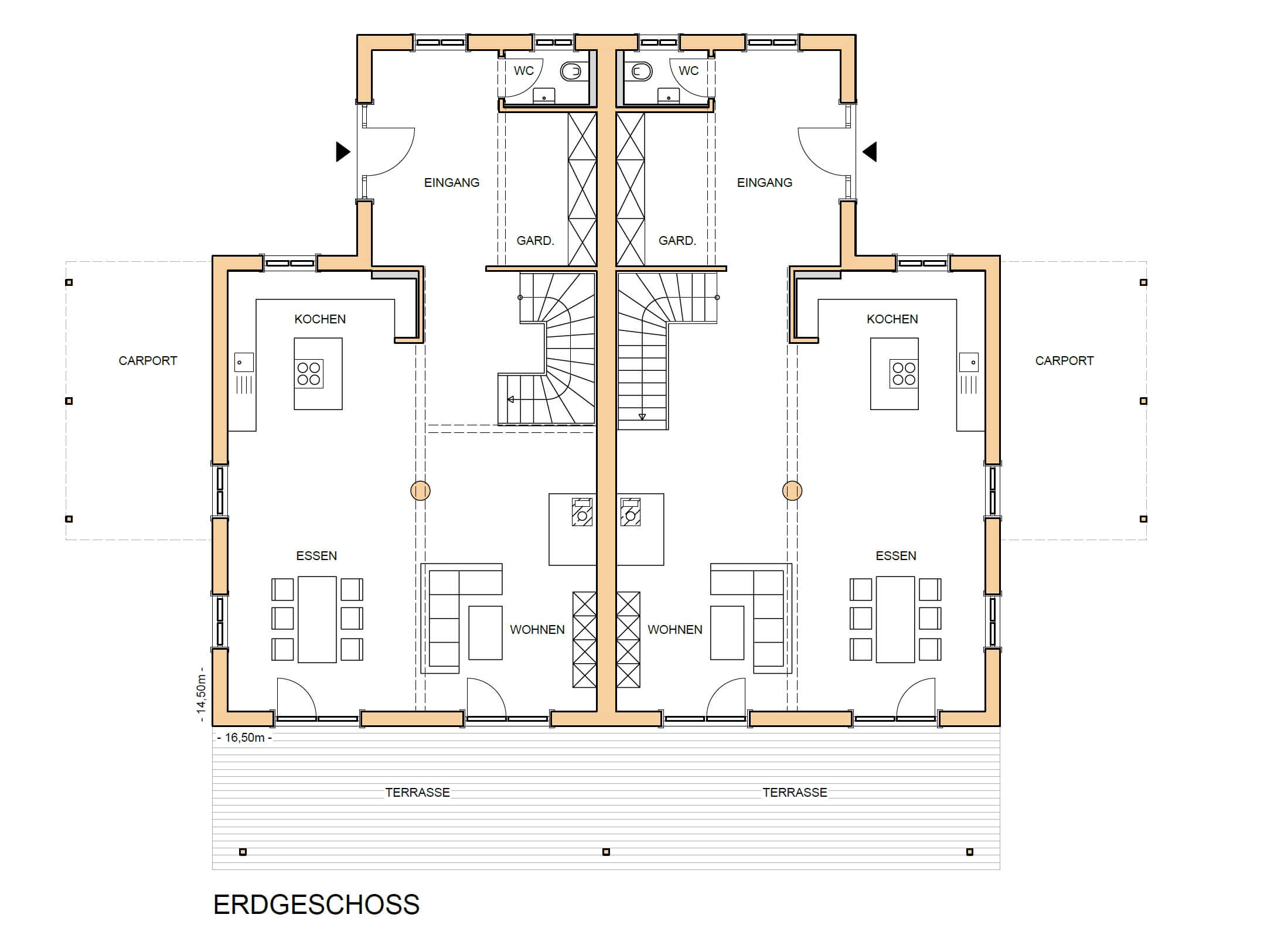 Ein Carport sowie eine großzügig überdachte Terrasse ergänzen den Grundriss. Die Terrasse ist direkt an den Wohnbereich angebunden und schafft einen witterungsgeschützten Außenraum, der über das ganze Jahr hinweg nutzbar ist. Klare Raumstrukturen, großzügige Flächen und eine auf Alltagstauglichkeit ausgelegte Planung prägen das Haus.