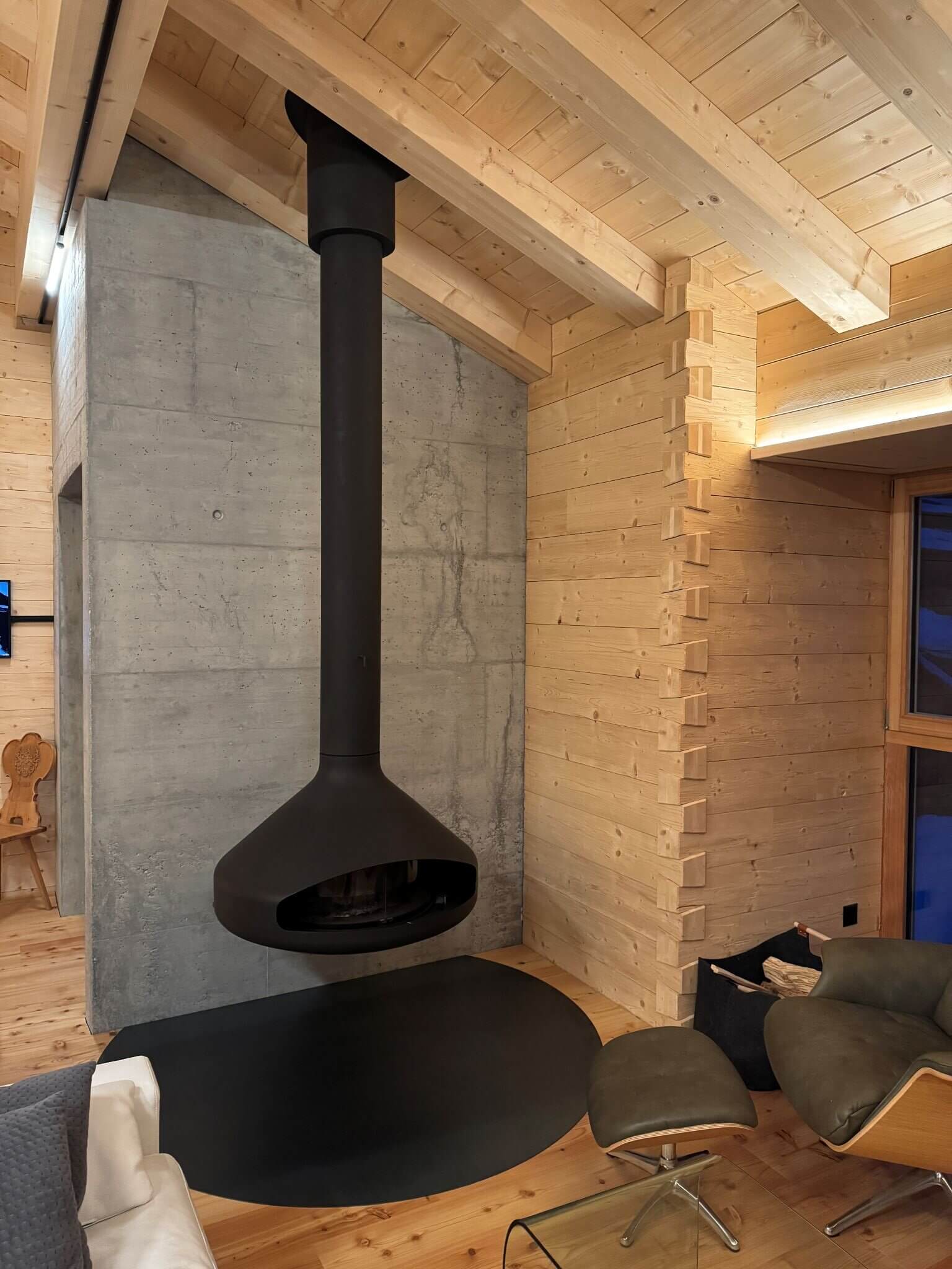 Ein besonderes Highlight: Das Blockhaus liegt in einem Ensemble mit Bauten des weltbekannten Schweizer Architekten Peter Zumthor, Träger des Pritzker-Preises. Es wurde individuell geplant um modernes Design mit dem vorhandenen Ensemble zu verbinden und fügt sich perfekt ein.