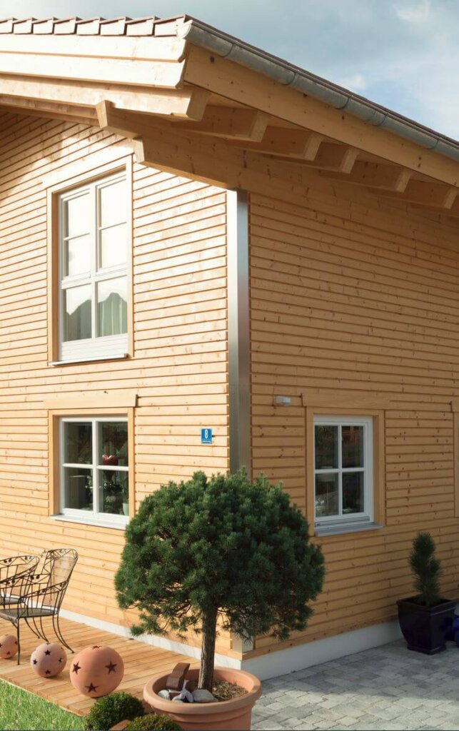 Individuelle Metallverkleidungen schützen die Blockecken und geben dem Blockhaus Rosenheim Stil und Farbe.