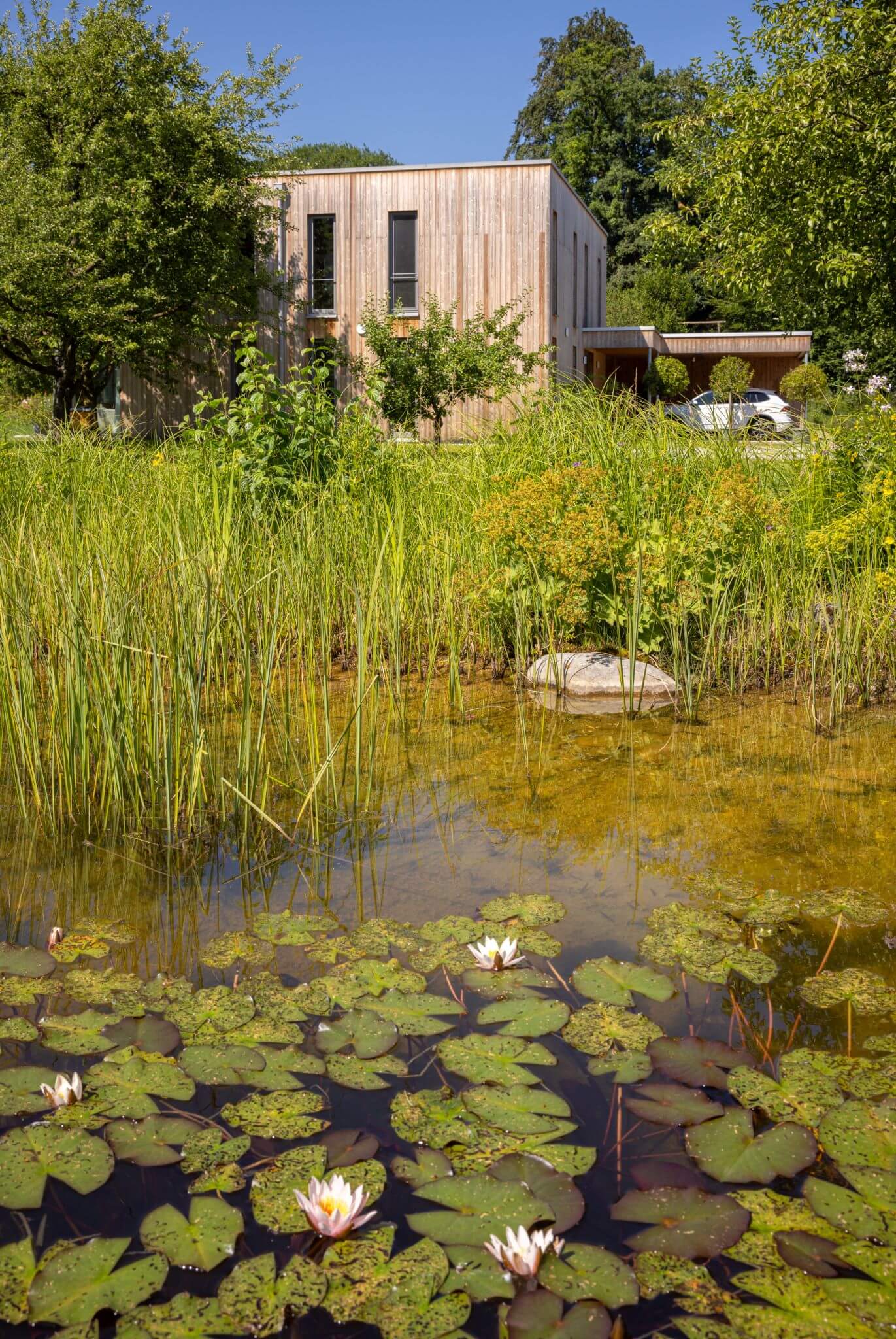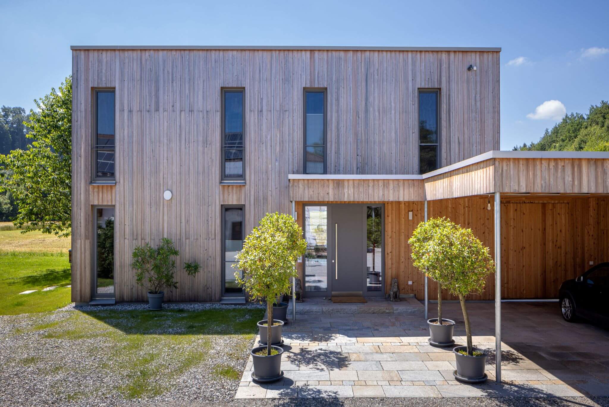 Von vorne zeigt sich das kubische Massivholzhaus Bayern mit Flachdach zurückhaltend, während es sich auf der Rückseite mit großen Panoramafenstern öffnet.
